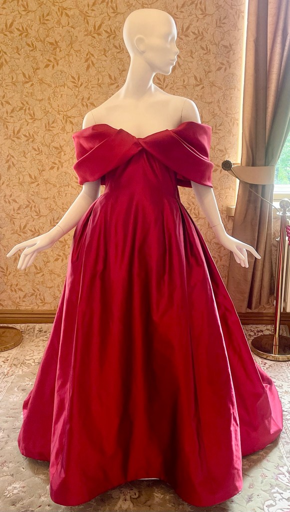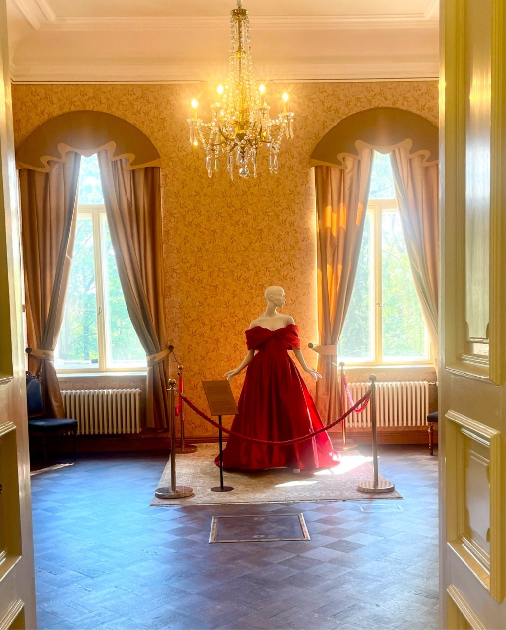 Alakerrassa voi jo haukkoa henkeä. Siellä on nimittäin nähtävänä suomalaisen muotisuunnittelija Anne-Mari Pahkalan suunnittelema häikäisevä uniikkipuku, joka nähtiin näyttelijä Alma Pöystin yllä Golden Globe -gaalassa tammikuussa 2024.
