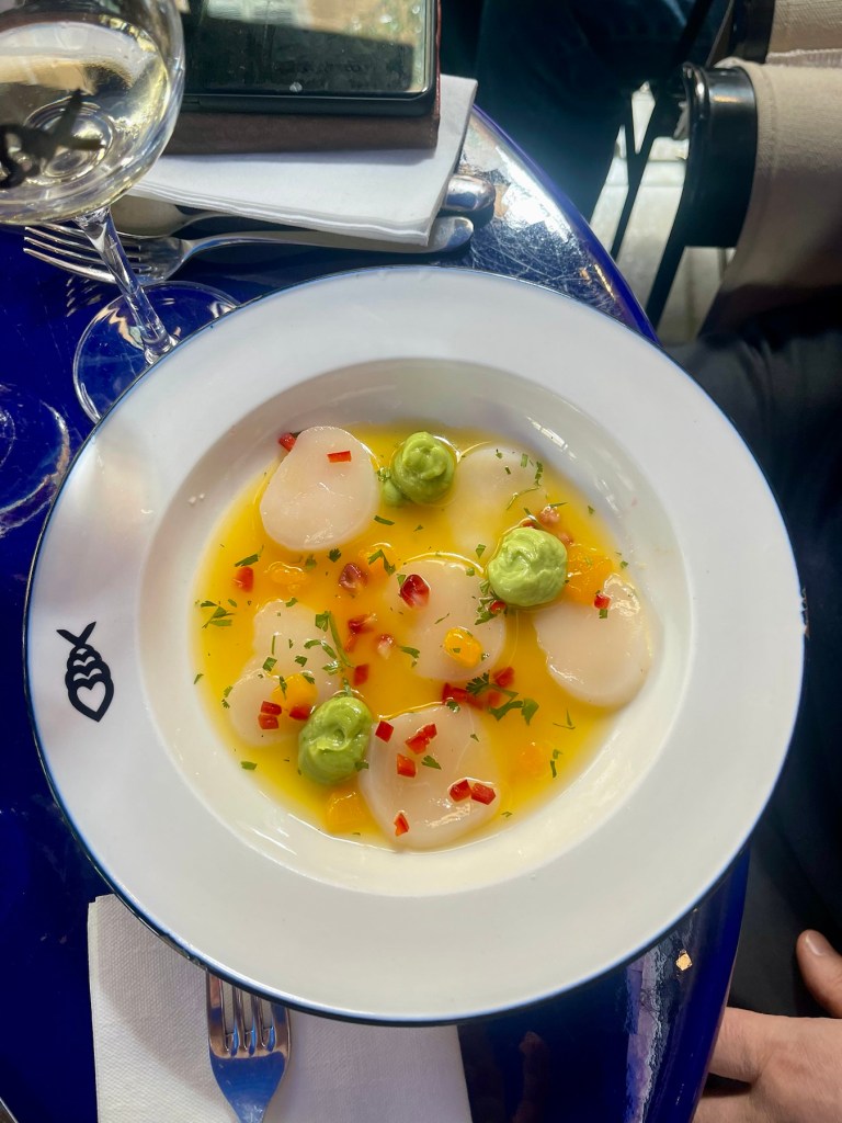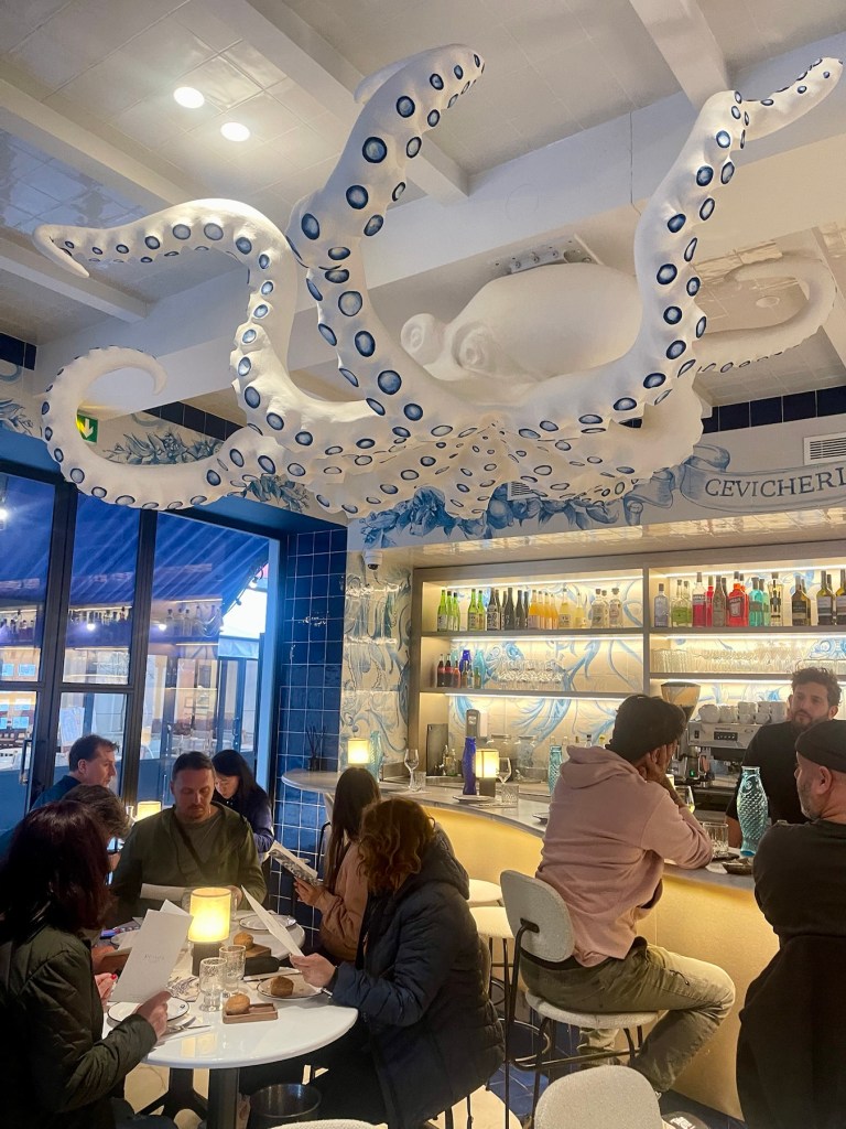 Ystävämme vinkkasi Ranska-illassamme Peixes-kalaravintolasta Oopperan lähellä. Nimi lausutaan ”pesh” (portugaliksi ”kala”). Sen sisarravintola on osoitteessa 5 rue Bonaparte, joka näkyi asuntomme parvekkeelta. Ihastuimme ravintolaan ikihyviksi ja nautimme siellä niin illallisen kuin lounaan. Yksimielisesti seurueemme paras ruokakokemus tällä matkalla!