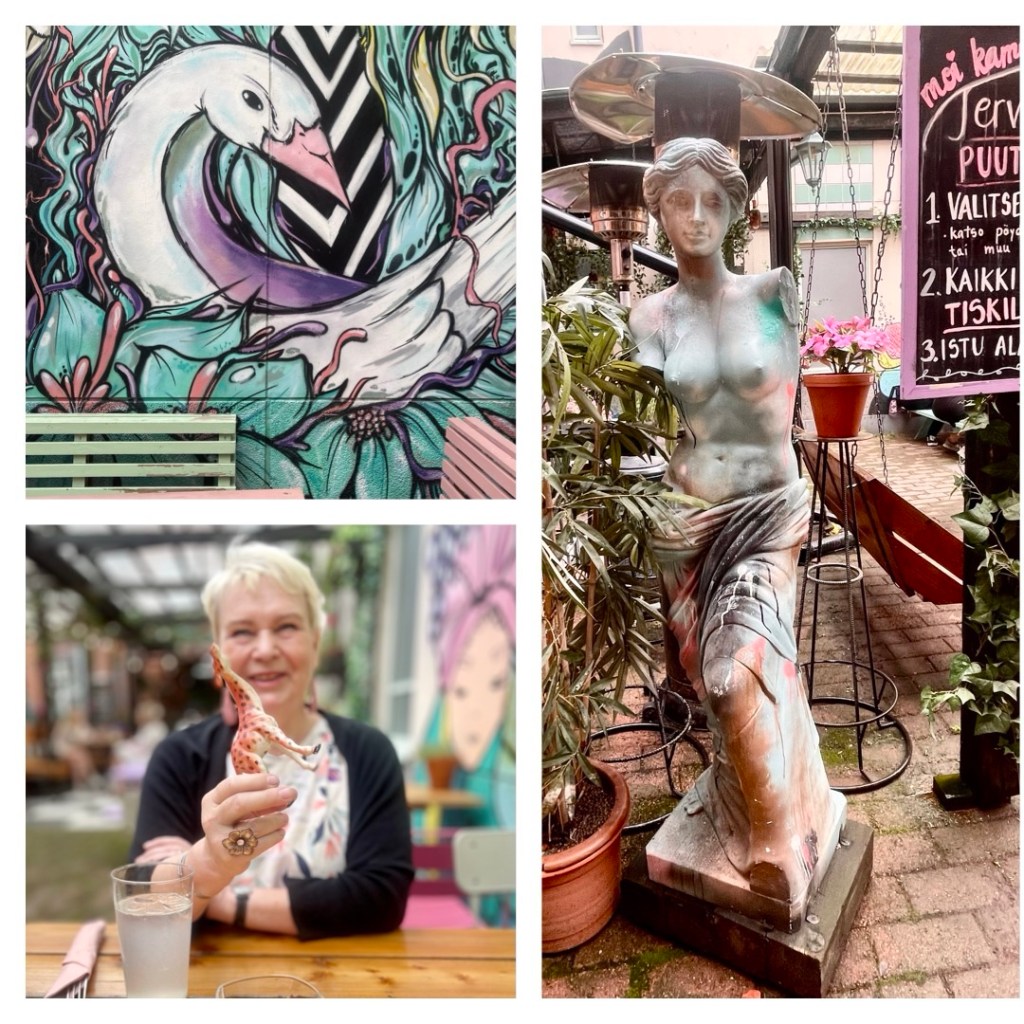 Teimme ystäväni Kaisan kanssa kesäretken Tampereelle katsomaan Muodin huipulla -näyttelyä. Sen nähtyämme pähkäilimme mihin menisimme syömään. Johonkin, jossa kumpikaan ei ole aikaisemmin ollut. Valitsimme ruokalistan perusteella ravintola Muusan. Ravintola näytti suljetuilta, mutta kyltit ohjasivat meidät Puutarhaan sillä : ”Aurinkoisella ja lämpimällä säällä herkkusuita palvelee Puutarha, kurjalla ja kylmällä kelillä Muusa.” Meillä kävi tuuri!