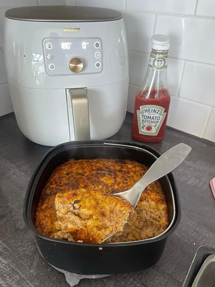 Valmista kilo melko löysää perunasosetta. Levitä perunasose uunivuokaan kastikkeen päälle. Ripottele pinnalle pari desiä juustoraastetta ja paista 200-asteisessa uunissa noin puoli tuntia. Tai airfryerissa 180 astetta/ 20 minuuttia.