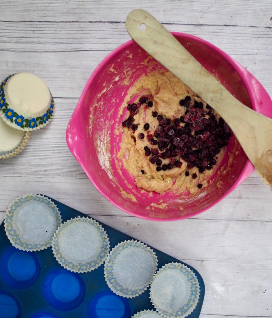 Lisää valitsemasi makuaineita tai -aineet taikinan joukkoon ja sekoita. Kuvassa pakastemustikoita.