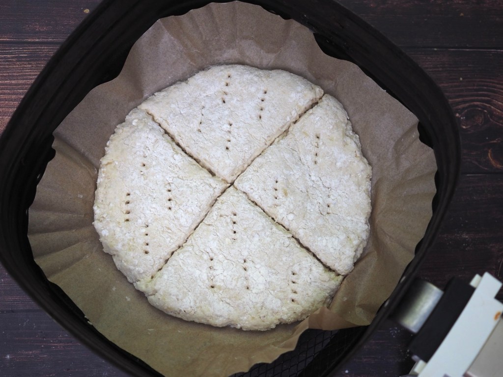 Tee teeleipätaikina edellisen ohjeen mukaan, mutta muotoile taikinasta vain yksi noin 2 cm:ä paksu leipä airfryerkoriin sopivan leivinpaperin päälle.