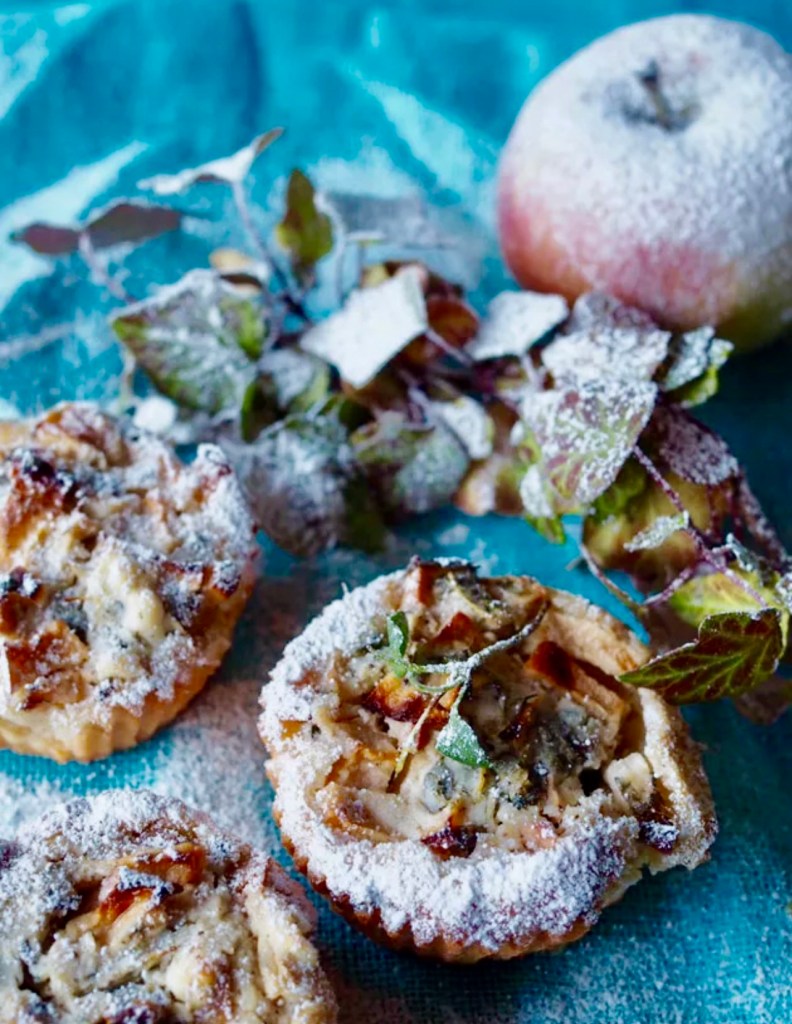 Kuumien juomien aika lähestyy! Glögin seuraksi olen pyöräyttänyt pienet omenapiiraat valmiista murotaikinasta muffinipeltiä apunani käyttäen. Jääkaapistani löytynyt vuohentuorejuusto ja timjami antoivat piiraille jännän, hieman ranskalaisen vivahteen. Olen tehnyt samankaltaisia piiraita aiemmin säilötyistä hapankirsikoista, joten vuohenjuusto ei ollut mikään aivan uusi innovaatio leivonnassani. Hyviähän näistä tuli ja en oikein osannut päättää, ovatko ne parhaimmillaan haaleina vai kylminä. Mutta mitään ekstraa ne eivät tomusokerilla puuteroinnin lisäksi kaipaa.