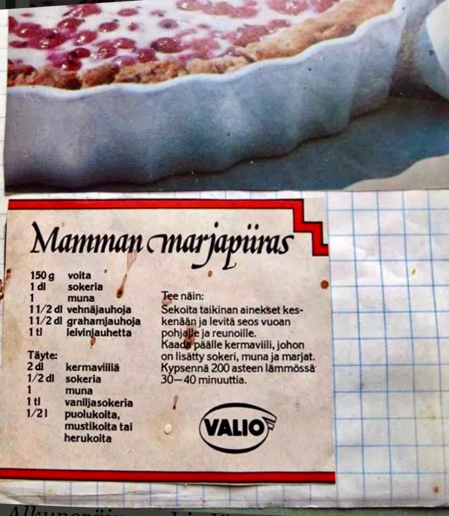 Pienen tutkivan ruokajournalismin ja ystävällisten aikalaistodistajien avulla selvisi, että ohje on Valion kokeilukeittiössä Kotivinkin entisen päätoimittajan, kotitalousopettaja Marja Järvelinin kehittämä ohje. Se julkaistiin lähes kaikissa aikakauslehdissä vuonna 1976. Järvelin työskenteli noihin aikoihin Valiolla.