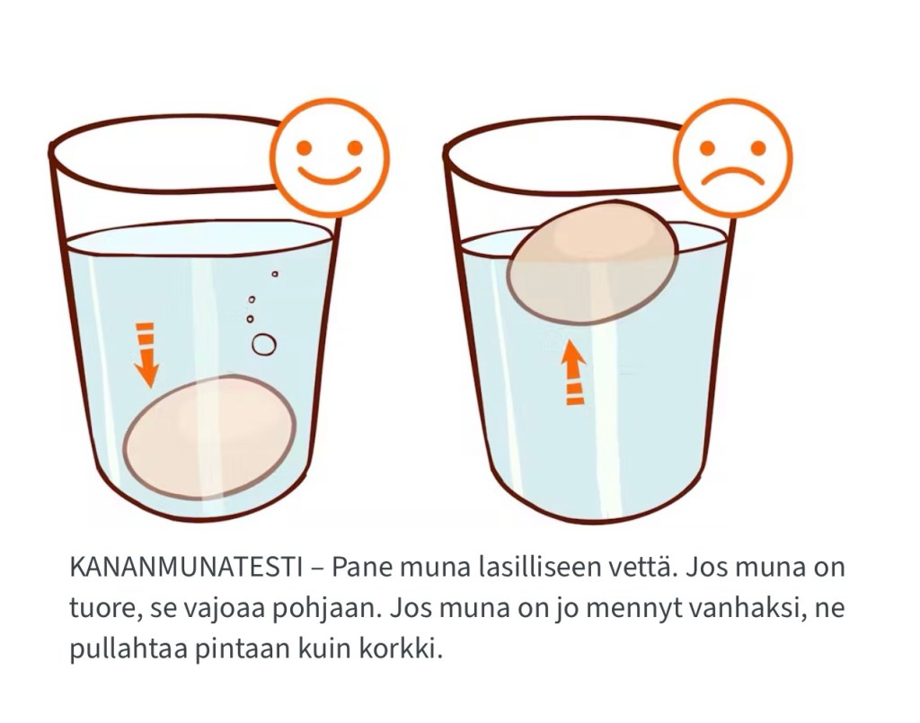 Yksi tapa tarkistaa tuoreus on tehdä vesikoe: tuore muna uppoaa, kun taas vanha muna kelluu.