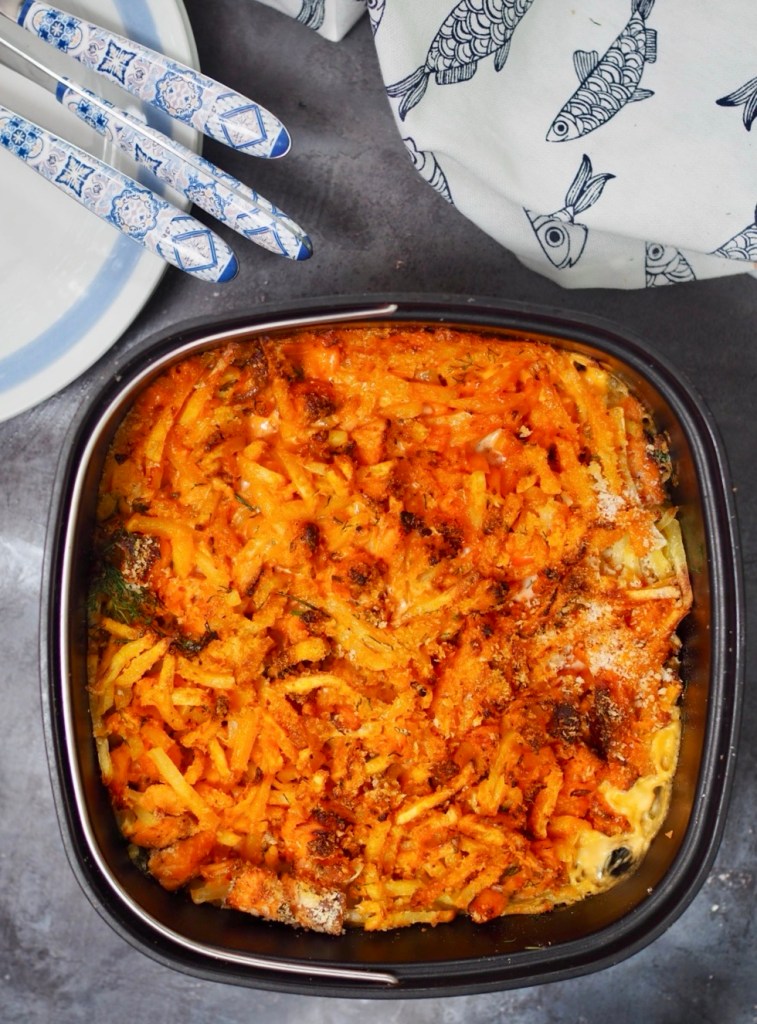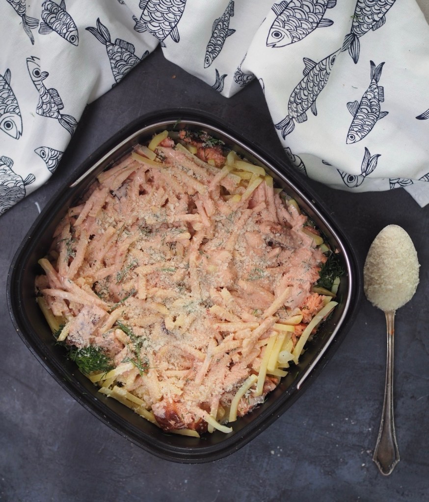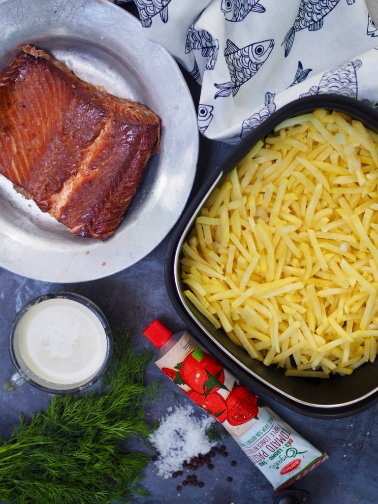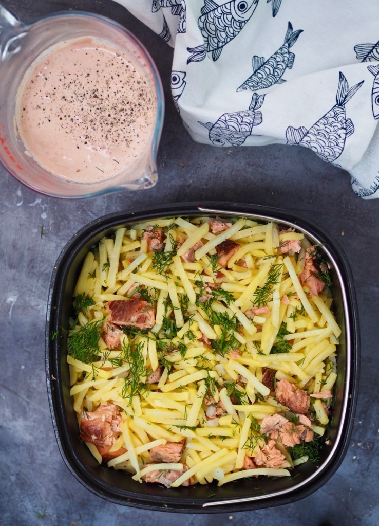 Kuutioi lohi, hienonna tilli. Lado airfryerin leivontavuokaan kerroksittain perunasipuliseosta, lohta ja tilliä,