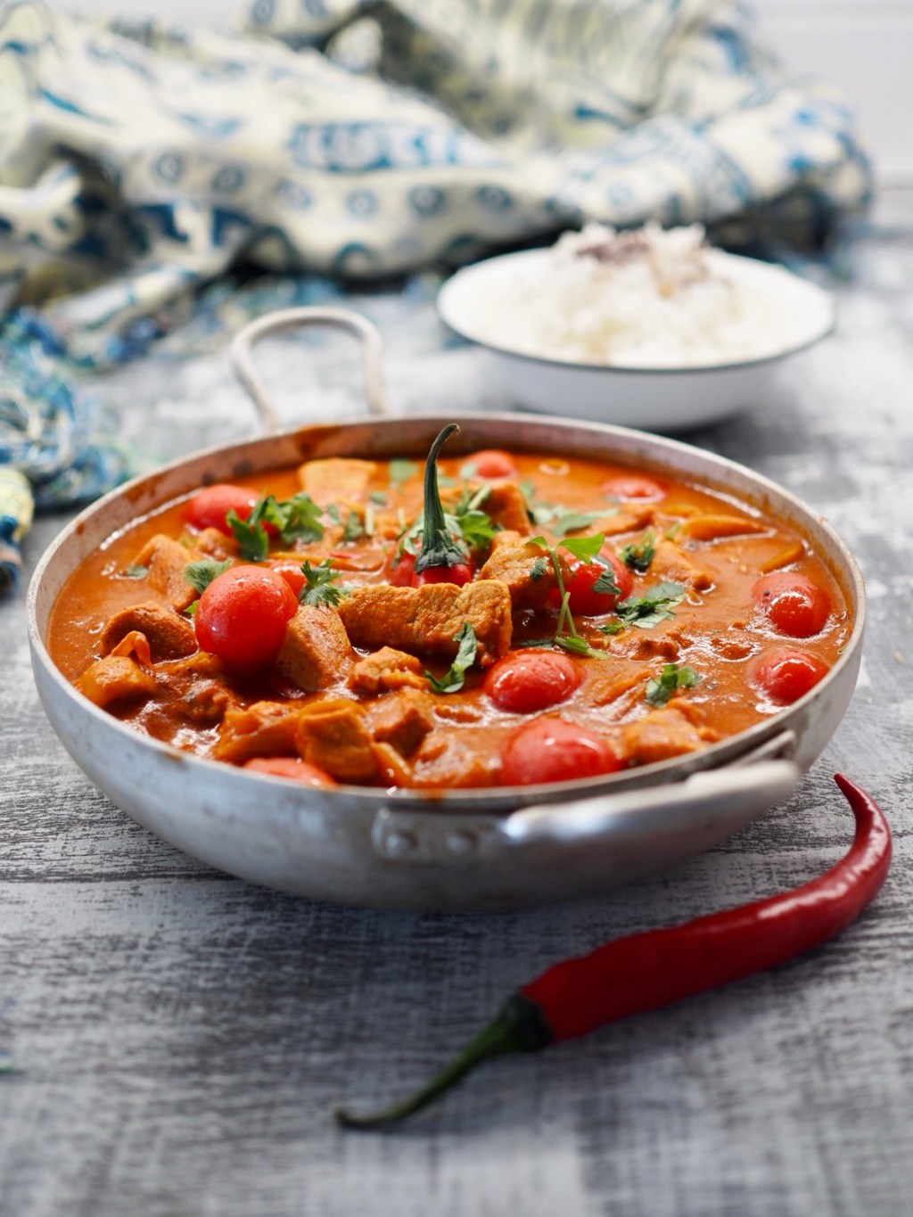 Sulata loput voista pannussa ja kuullota sipuli- ja valkosipulisilppu voissa. Lisää Garam masala, inkivääri ja chili, paista seosta hetki. Lisää pannulle paseerattu tomaatti, ketsuppi ja suola, kuumenna kiehuvaksi. Lisää kastikkeeseen possupalat ja kirsikkatomaatit. Anna kastikkeen hautua miedolla lämmöllä 10-15 minuuttia.