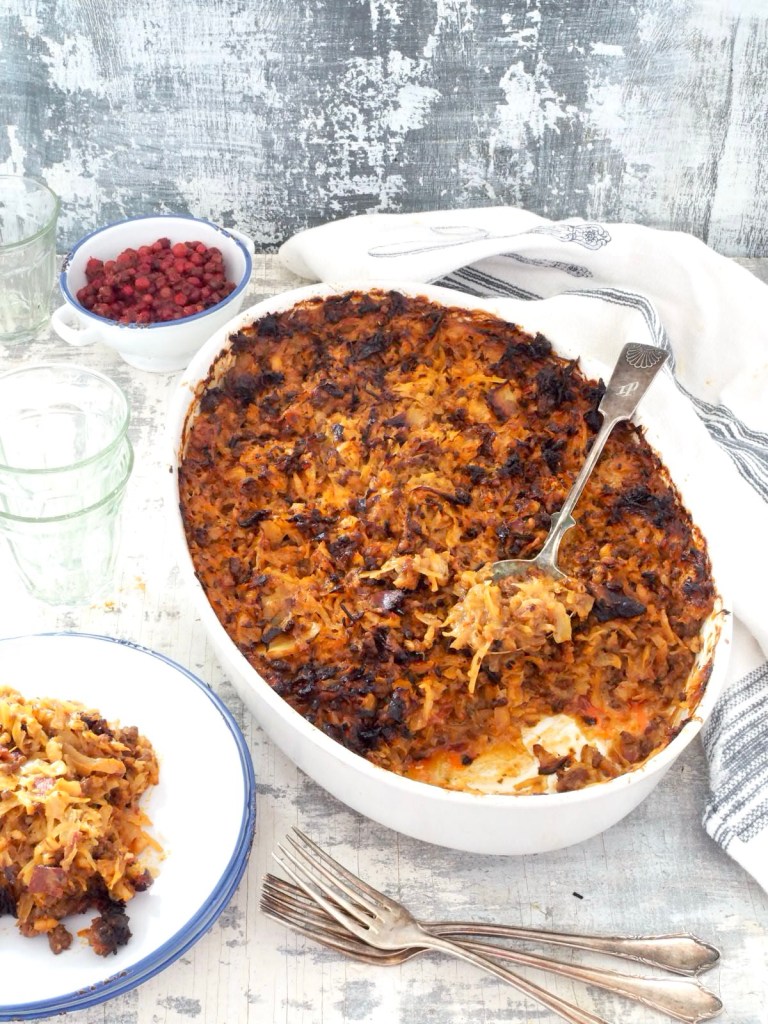 Tiinan vinkki! Mitä kauemmin maltat laatikkoa paistaa, sitä mehukkaammaksi kaali muuttuu.