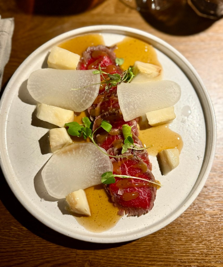 Söin alkuruoaksi tatakin kotimaisesta naudan sisäfileestä, selleriä & sieniponzun, 14 e. Aivan mielettömän hyvää! Liha suorastaan suli suussa.