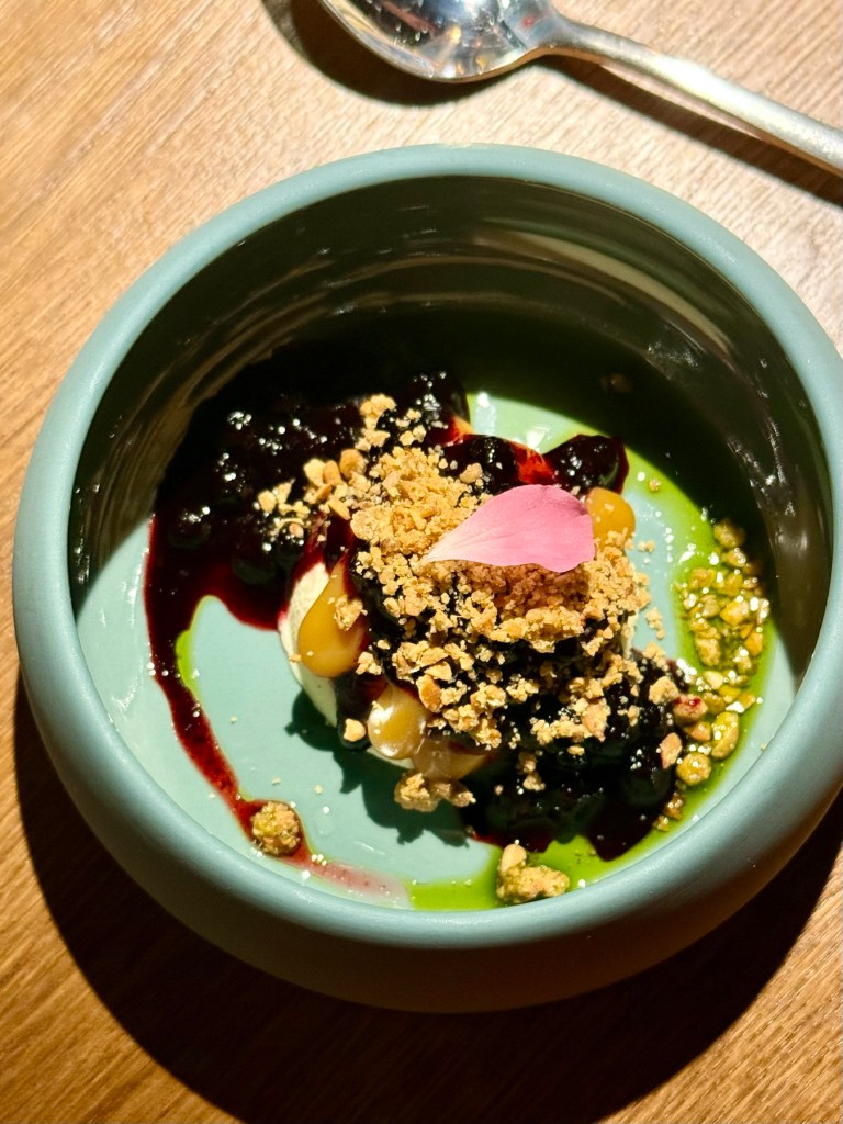 Jälkiruoan hapankerman, mustikkachutneyn ja lipstikkaöljyn yhdistelmä on hätkähdyttävä, mutta varsin mainio. Se toi mieleen lakritsin.