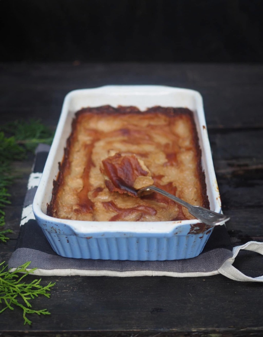 Kaada seos voideltuun uunivuokaan vain puolilleen, sillä laatikko kuohuu ja kuplii kypsentämisen aikana. Jos haluat, pane pari voinokaretta pinnalle.