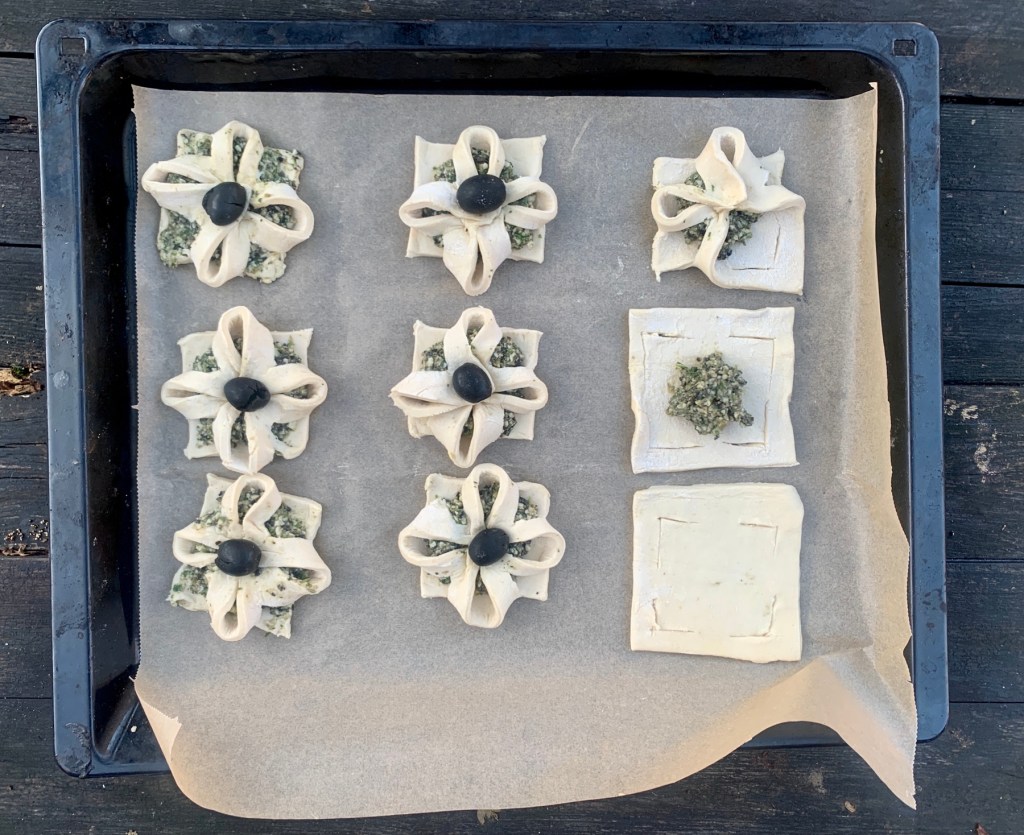Voit tehdä perinteisiä joulutähtiä tai kuvan mukaisia juustokukkia. Jaa jokainen torttutaikinalevy puoliksi ja tee jokaiseen neliön kulmaan kulman muotoinen viilto. Pane lusikallinen oliivi-juustotahnaa torttulevylle ja käännä jokainen kulma keskelle. Voitele tortut munalla ja ripottele päälle juustoraastetta. Viimeistele koristelu kokonaisella oliivilla.