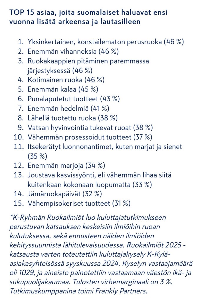 K-ryhmä on jälleen listannut merkittävimmät ruokaan liittyvät trendit vuodelle 2025. Ennusteen mukaan suomalaiset etsivät arkeensa yhä enemmän kokonaisvaltaista hyvinvointia, ilo ja inspiraatio palaavat kotikeittiöihin tauon jälkeen, ja erityisesti pienet taloudet kokevat uuden täsmäruokailun ilmiön.