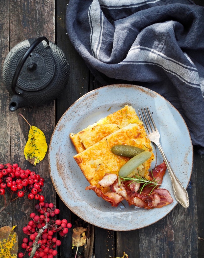 Voit myös valmistaa röstin etukäteen ja kuumentaa sen tarjolle. Laita silloin juustoviipale perunapaistoksen päälle ja kuorruta perunakakku 225 asteisessa uunissa ennen tarjoilua.