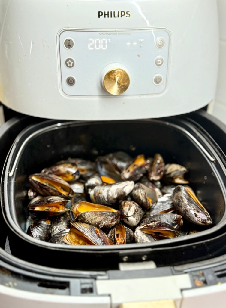 Uudenvuoden aattona kävin löhimarketissani ja huomasin tuoreiden simpukoiden maksavan 5,95 e/kg. Siitähän se ajatus merellisestä pikaruoasta sitten lähti. Perunat kypsyvät airfryerissa samassa ajassa kun simpukat valmistuvat liedellä.