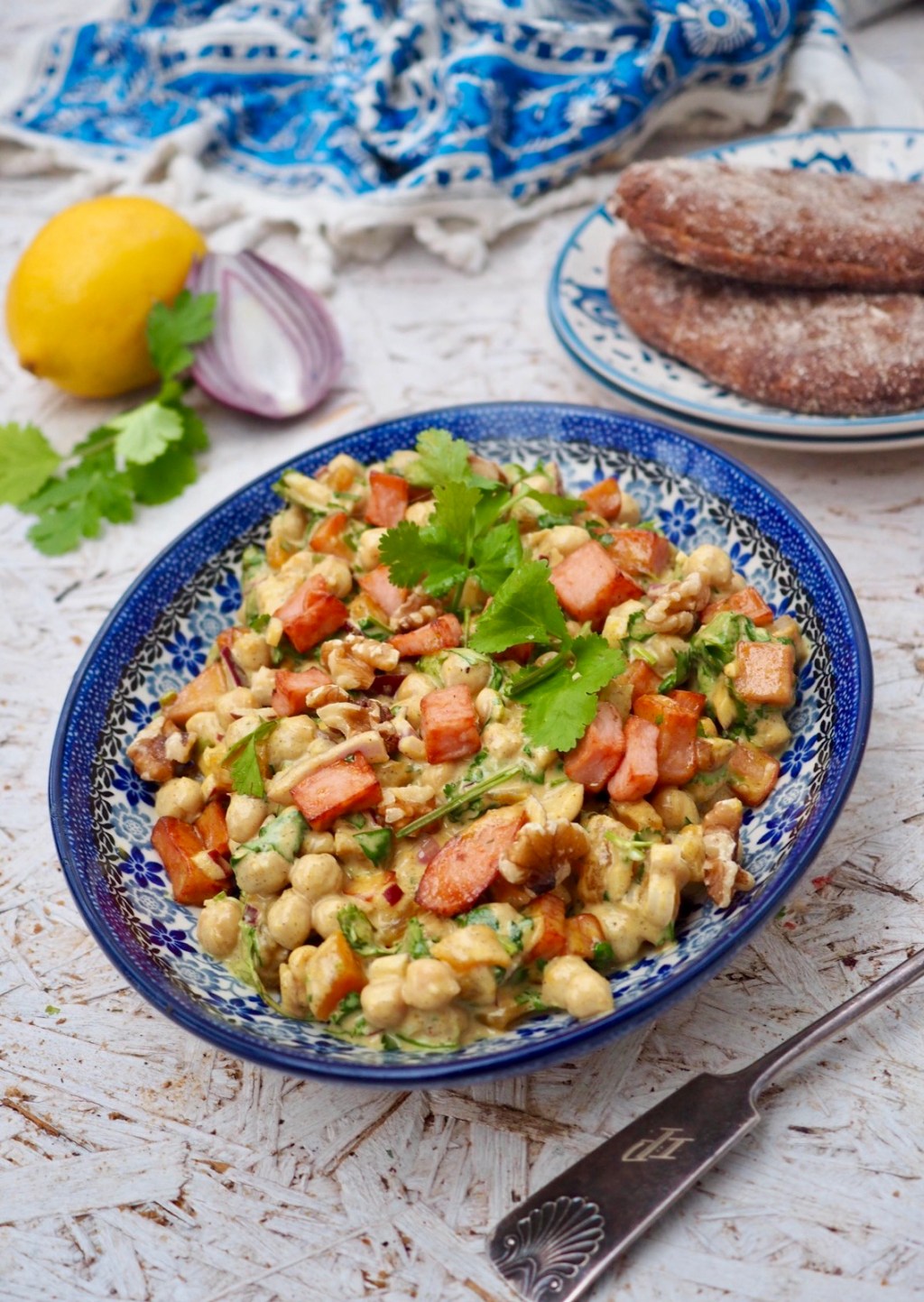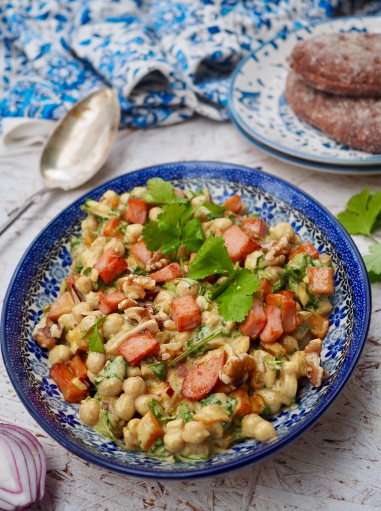Anna valmiin Coronation Chickpea -salaatin maustua jääkaapissa vähintään tunnin ajan, jotta maut ehtivät tasaantua.