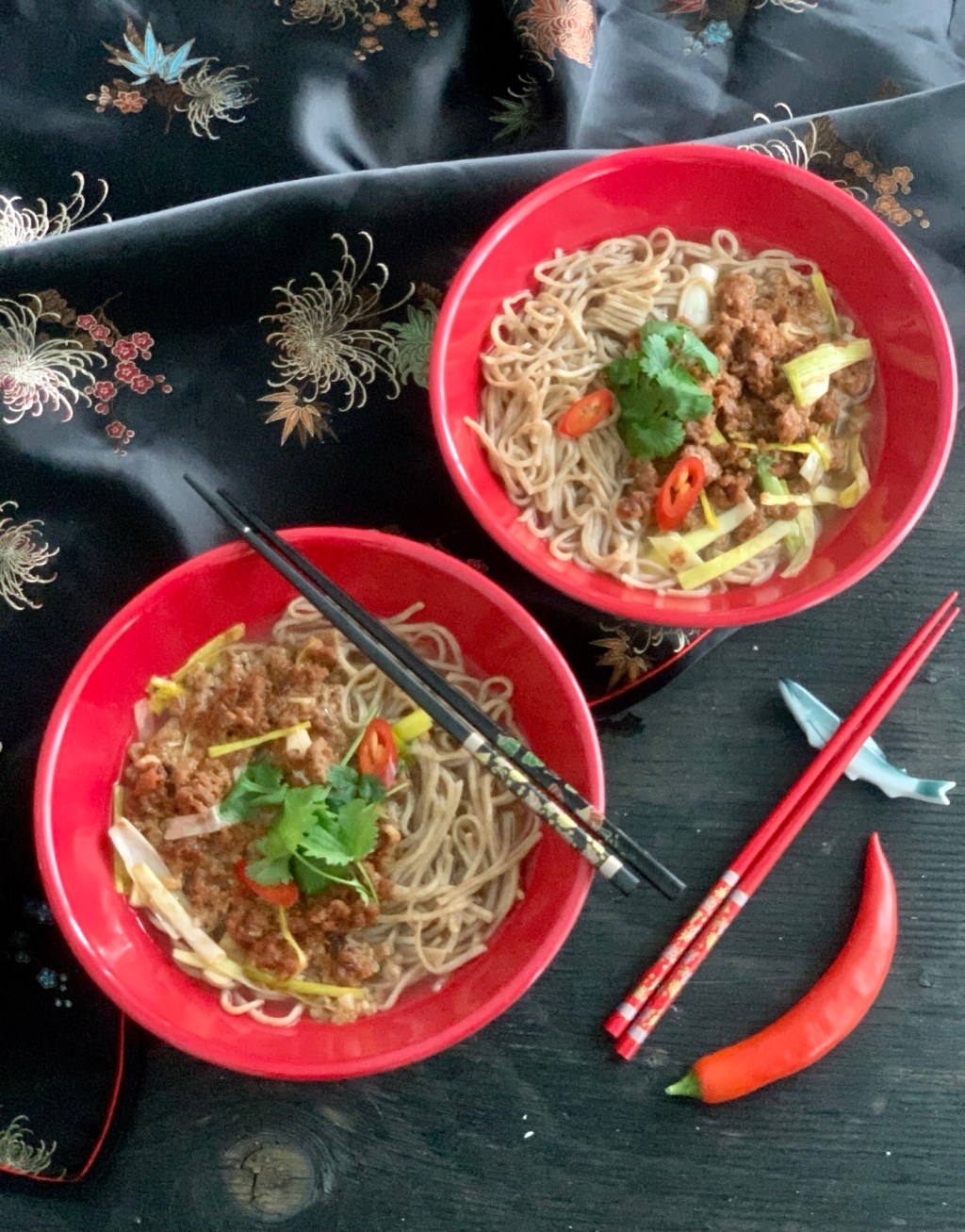 Dan dan -nuudelikeitto maistuu kasvissyöjälle talvipakkasilla. Sekaani voi tietty tehdä keiton sika-nauta jauhelihasta.