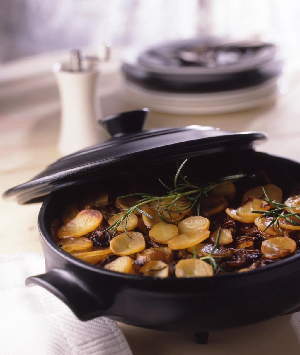Lado kasvikset ja lihat kerroksittain uunivuokaan tai pataan. Ripottele väleihin hieman suolaa, jauhettua maustepippuria, rosmariinia ja hienonnettua valkosipulia. Jätä perunakerros päällimmäiseksi. Lisää lihaliemi ja olut pataan niin, että neste peittää koko komeuden.