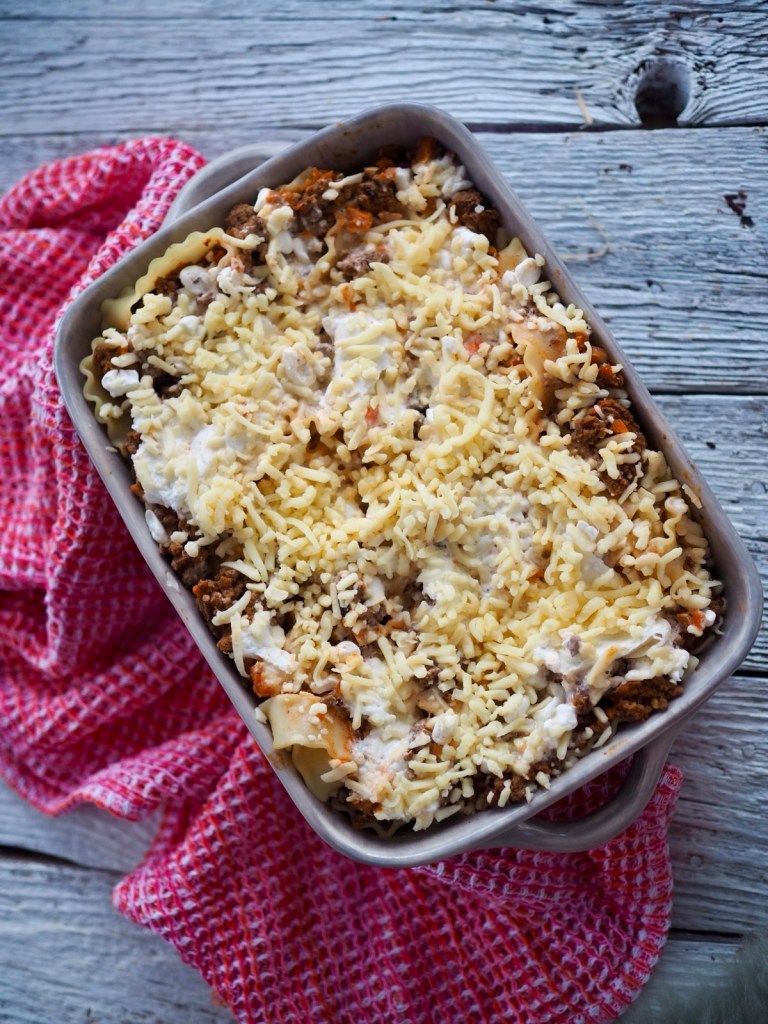 Voitele uunivuoka (noin 23×33 cm) kevyesti öljyllä tai voilla. Kokoa vuoka kuten lasagne: Laita vuoan pohjalle kerros spagettia. Lisää päälle puolet jauhelihakastikkeesta. Levitä sitten juustoseos spagetin ja kastikkeen päälle. Lisää loput jauhelihakastikkeesta juustoseoksen päälle. Lopuksi, laita jäljelle jäänyt spagetti vuoan päälle.
