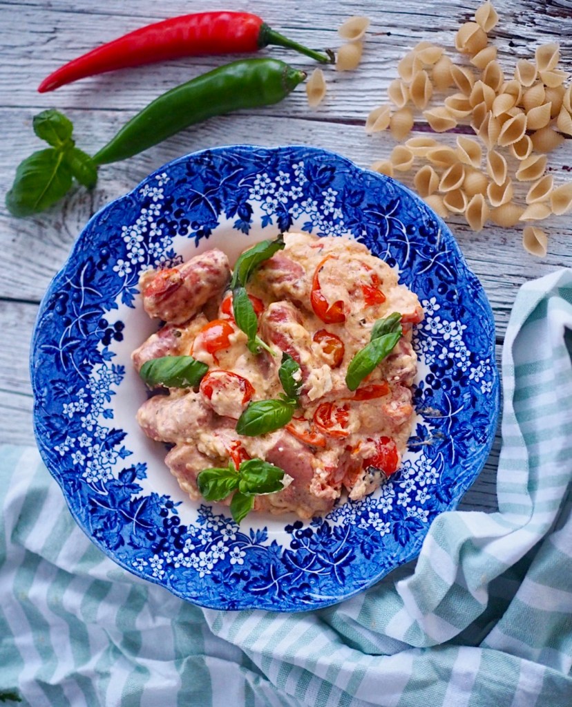 Lisää pasta kastikkeeseen, sekoita hyvin, koristele basilikalla ja nauti heti.