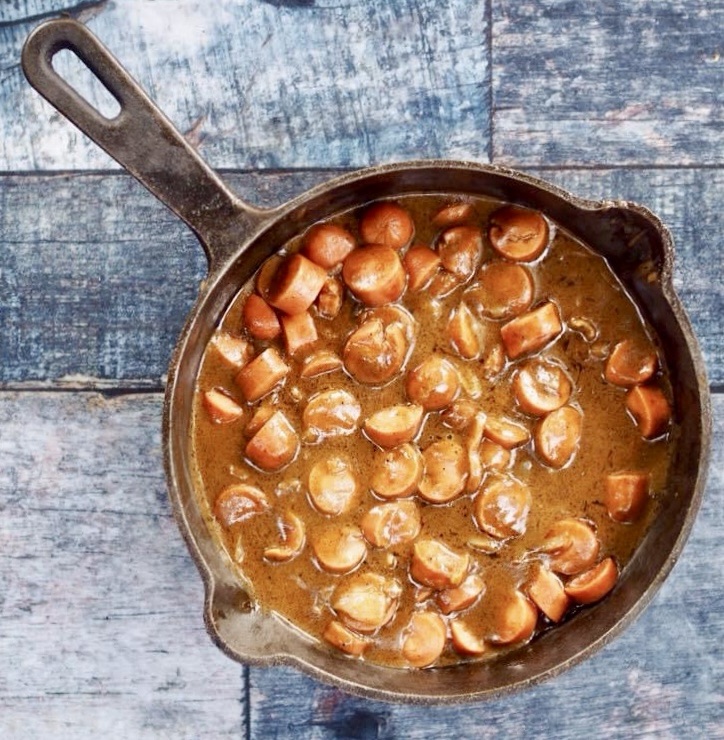 Makkarakastike: 200 g makkarakuutioita tai nakkeja, 1 hienonnettu sipuli