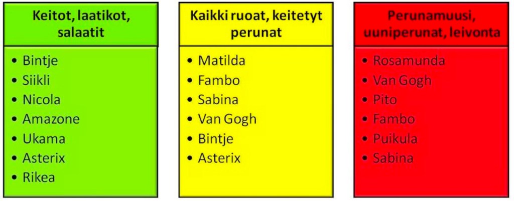 Jo syyslukukaudella olimme puhuneet oikean perunalajikkeen valinnasta valmistettavaan ruokalajiin. Nyt meillä oli vihreän pussin eli kiinteälajikkeisia perunoita kun halusimme, etteivät perunat hajoa keitettäessä.