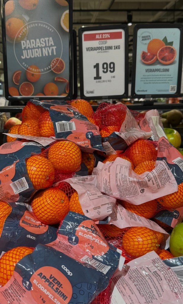 Mikä ihmeen sitrusten parsa? kysyi joku seuraajani. Sillä tarkoitan veriappelsiinin lyhyttä satokautta, joka kestää vain vuodenvaihteesta huhtikuuhun. Appelsiineja ja muita sitruksia kun saa ympäri vuoden.