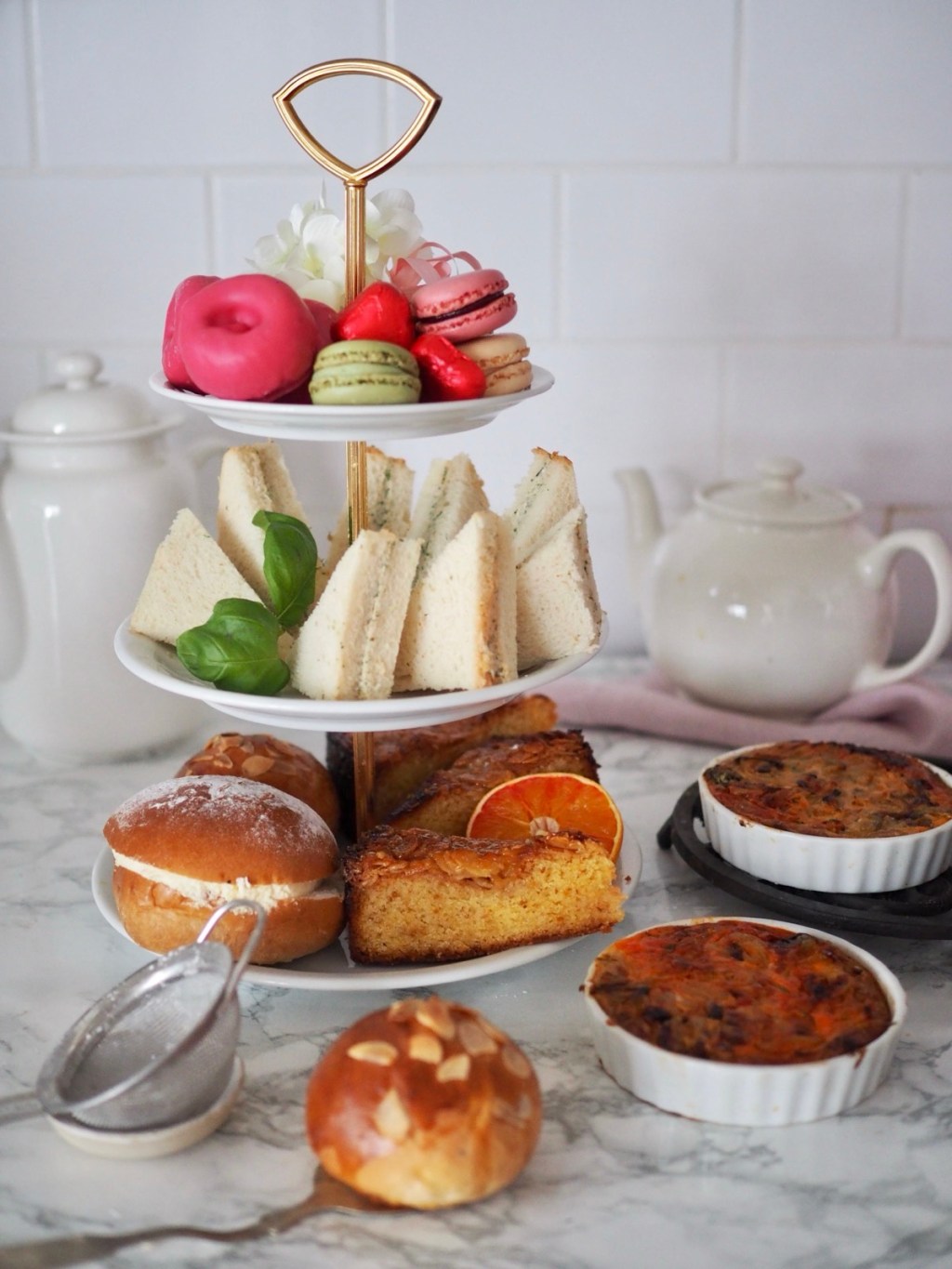 Teetarjoiluni koostui sesonkiherkuista: veriappelsiini-toskakakusta, laskiaispullista, sipulipiirakasta, amerikkalaisista piimäskonsseista ja lohitahnalla täytetyistä kolmioleivistä. Mutta ei kannata ottaa stressiä, vähempikin riittää.