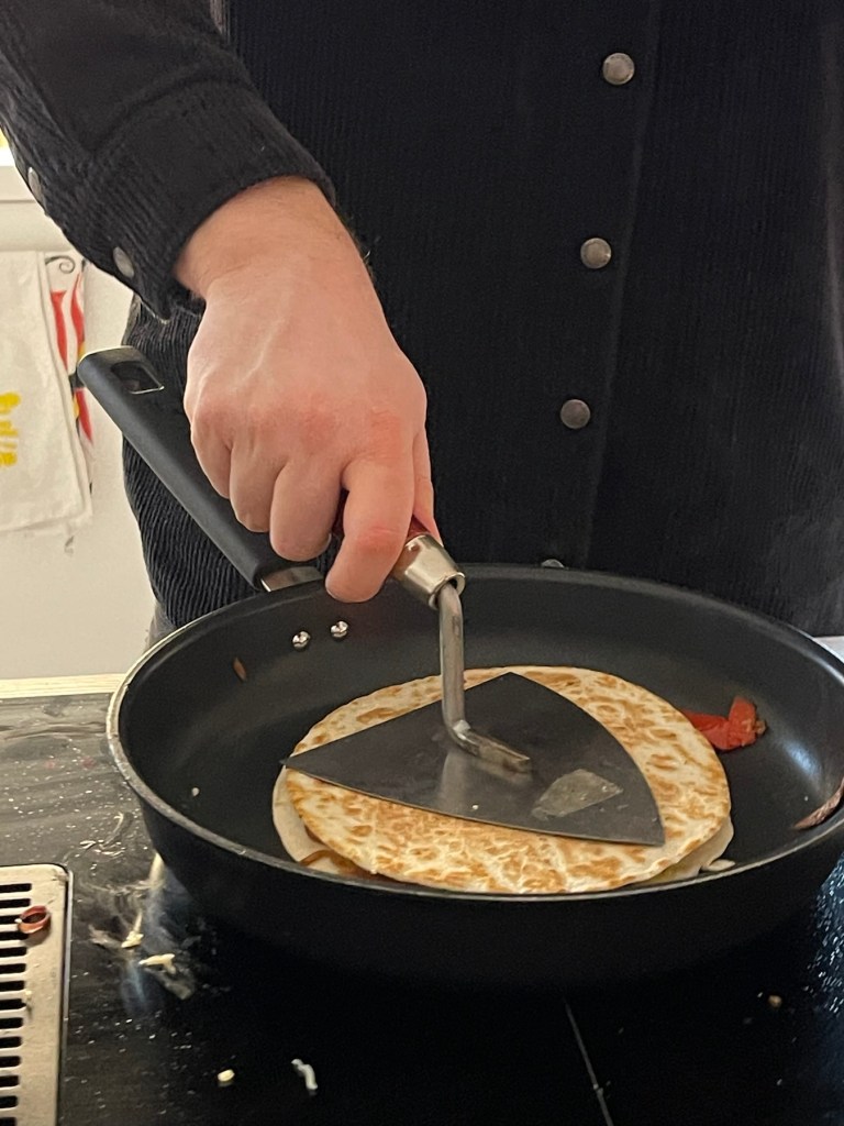 Paista quesadilloja paistinpannulla miedolla lämmöllä molemmin puolin niin, että juusto sulaa. Paina lettua pannua vasten, jotta se paahtuu.