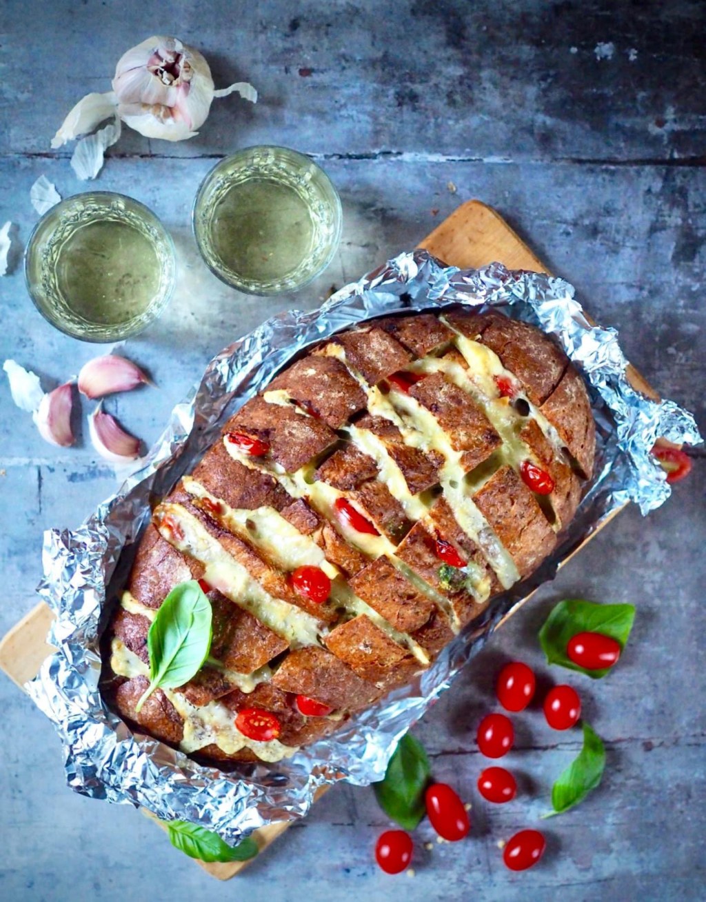 Kääri leipä folioon ja kypsennä sitä ensin 8 minuuttia 200-asteisessa uunissa. Avaa folio ja jatka kypsentämistä kunnes juusto sulaa ja saa hieman väriä, noin 12-15 minuuttia.