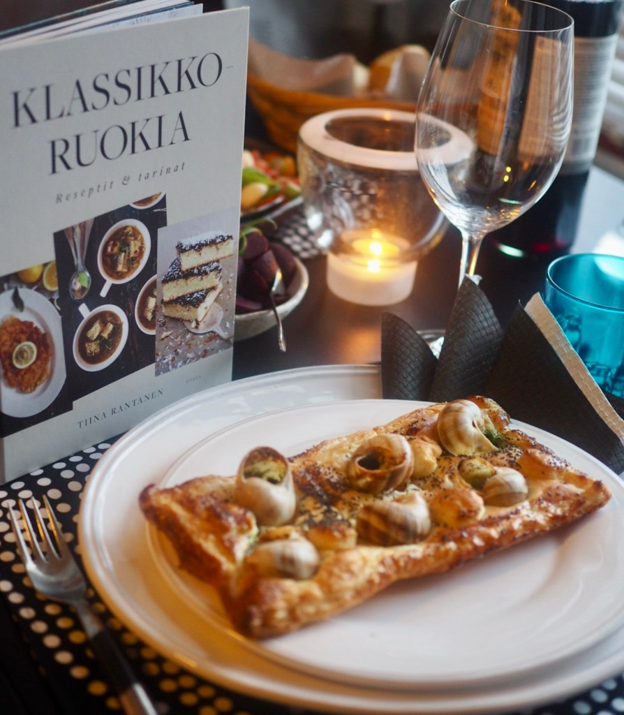 Jos ihmettelet, miten tuo annos syödään, niin annan pari vinkkiä: kaiva etanat koteloistaan cocktailtikun avulla, kaada valkosipulivoi ”etanapannulle” ja nauti se leipänä.