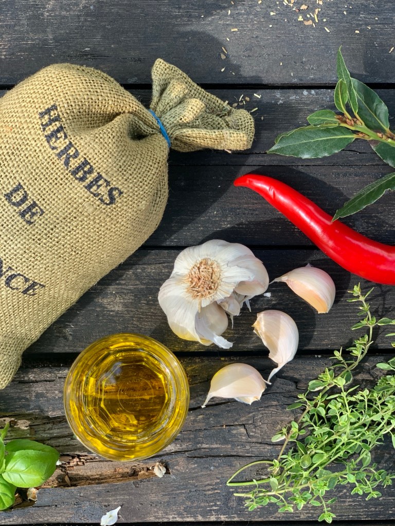 Hienonna valkosipulinkynnet ja tuoreet yrtit.