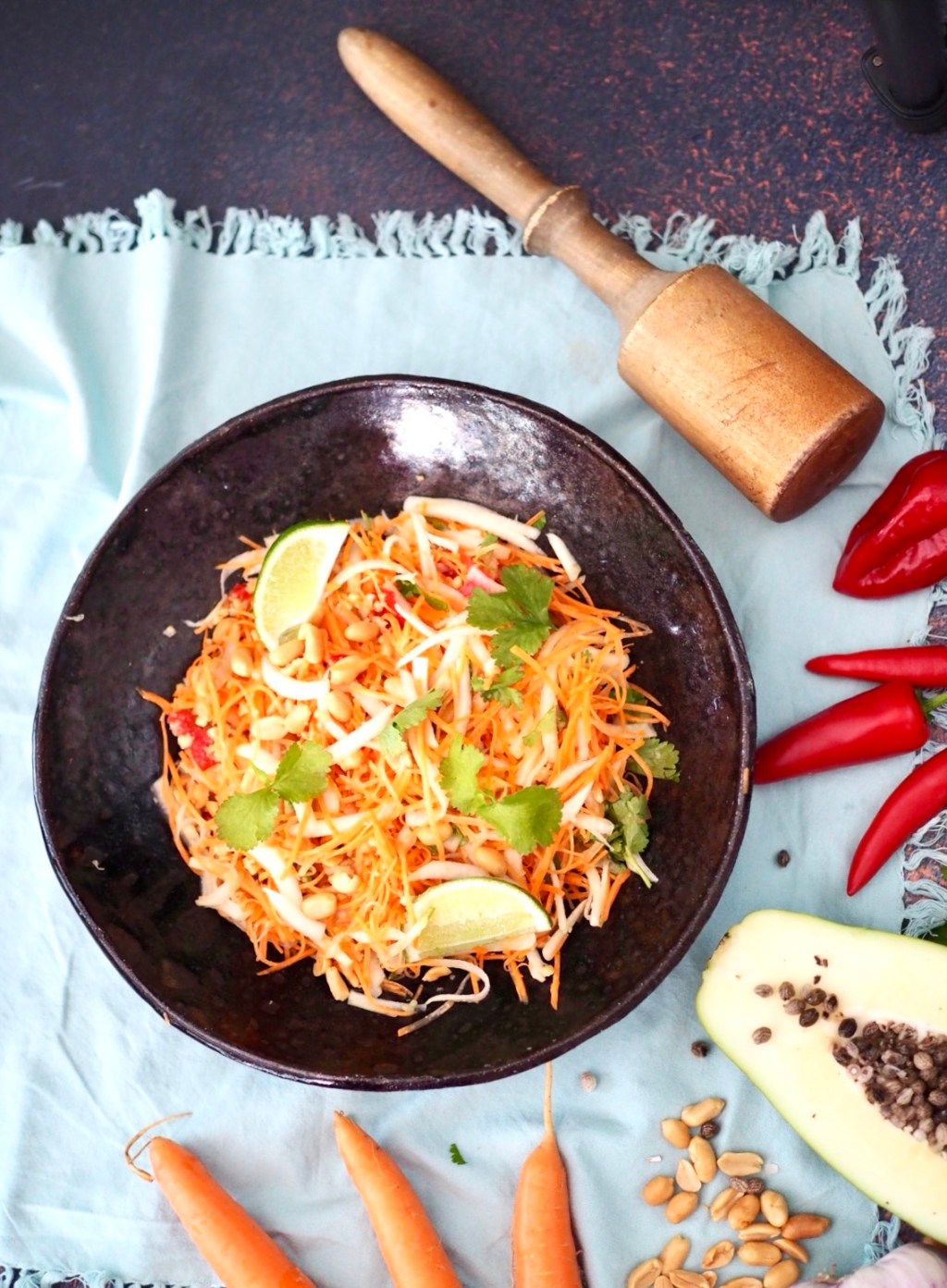 Vihreää papaijaa saa etnokaupoista, mutta sen voi meidän oloissamme korvata raaoilla porkkanoilla, kesäkurpitsalla tai varhaiskaalilla, jotka tuovat salaattiin samankaltaista rapeutta ja rakennetta.
