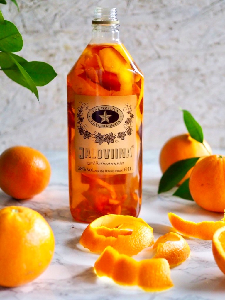 Anna appelsiinijallun maustua ja tekeytyä pari viikkoa ennen tarjoilua huoneenlämmössä. Kääntele pulloa silloin tällöin.