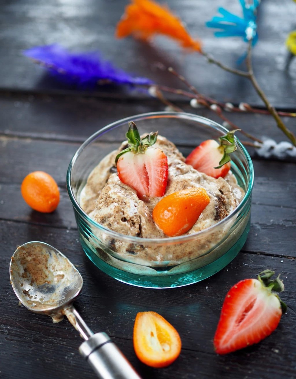Ota jäätelö sulamaan puoli tuntia ennen tarjoilua. Koristele mämmijäätelö mansikoilla, yrteillä ja pääsiäismunakarkeilla.