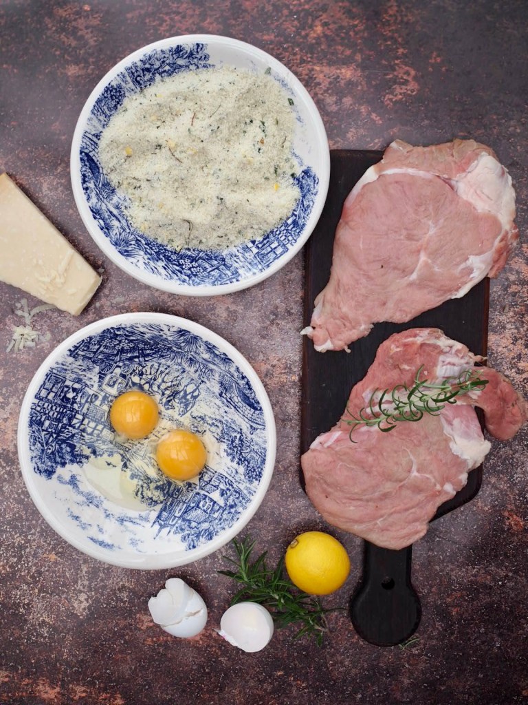 Mausta liha suolalla ja pippurilla. Pyöräytä vehnäjauhoissa, kasta kevyesti vatkatussa munassa ja lopuksi pyöräytä leike juustolla ja yrteillä maustetussa korppujauhoissa. Anna leikkeiden kuivahtaa vartin verran ennen paistamista, jotta panerointi kiinnittyy lihaan.