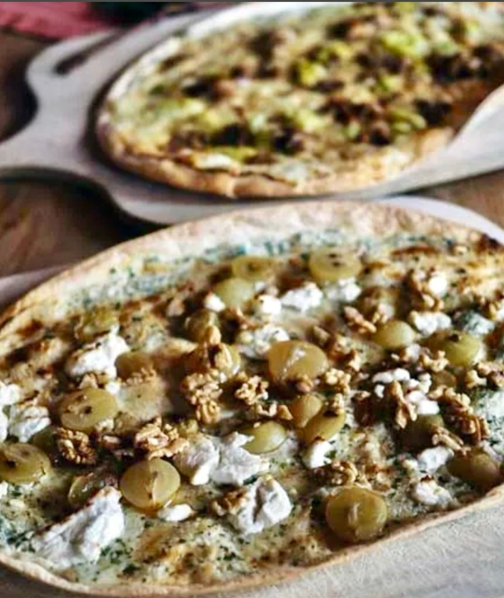 Jaa taikina kahteen tai neljään osaan ja kaulitse palat soikeiksi, hyvin ohuiksi pohjiksi. Levitä päälle ranskankermaseosta. Lisää vuohenjuusto, viinirypäleet ja pähkinärouhe.