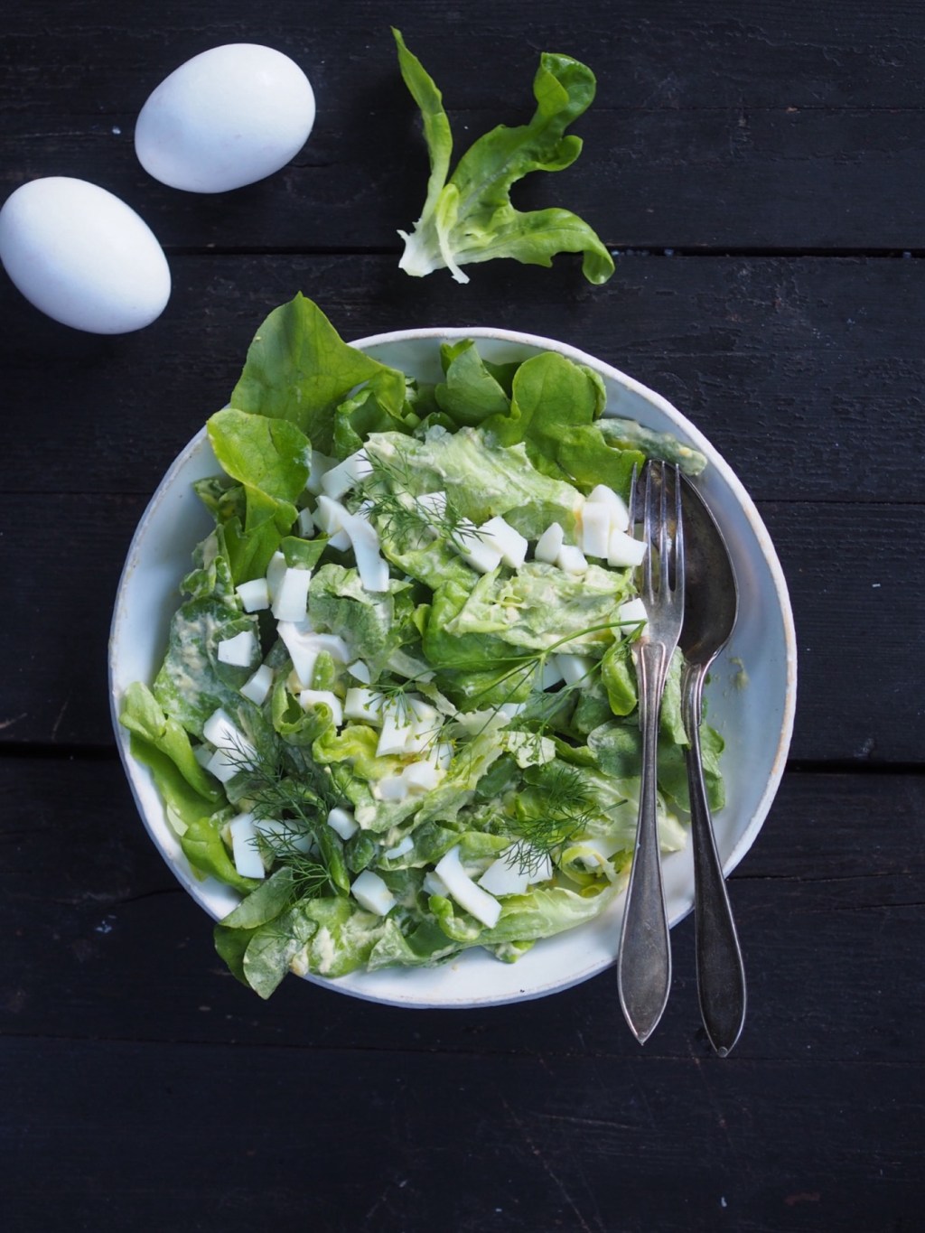 Isoäidin perinteisessä vanhanajan salaatissa keitetyt kananmunat viihtyvät vihreällä salaattipedillä keltuaisella saostetun kastikkeen kanssa. Lapsuuden kesäherkku!