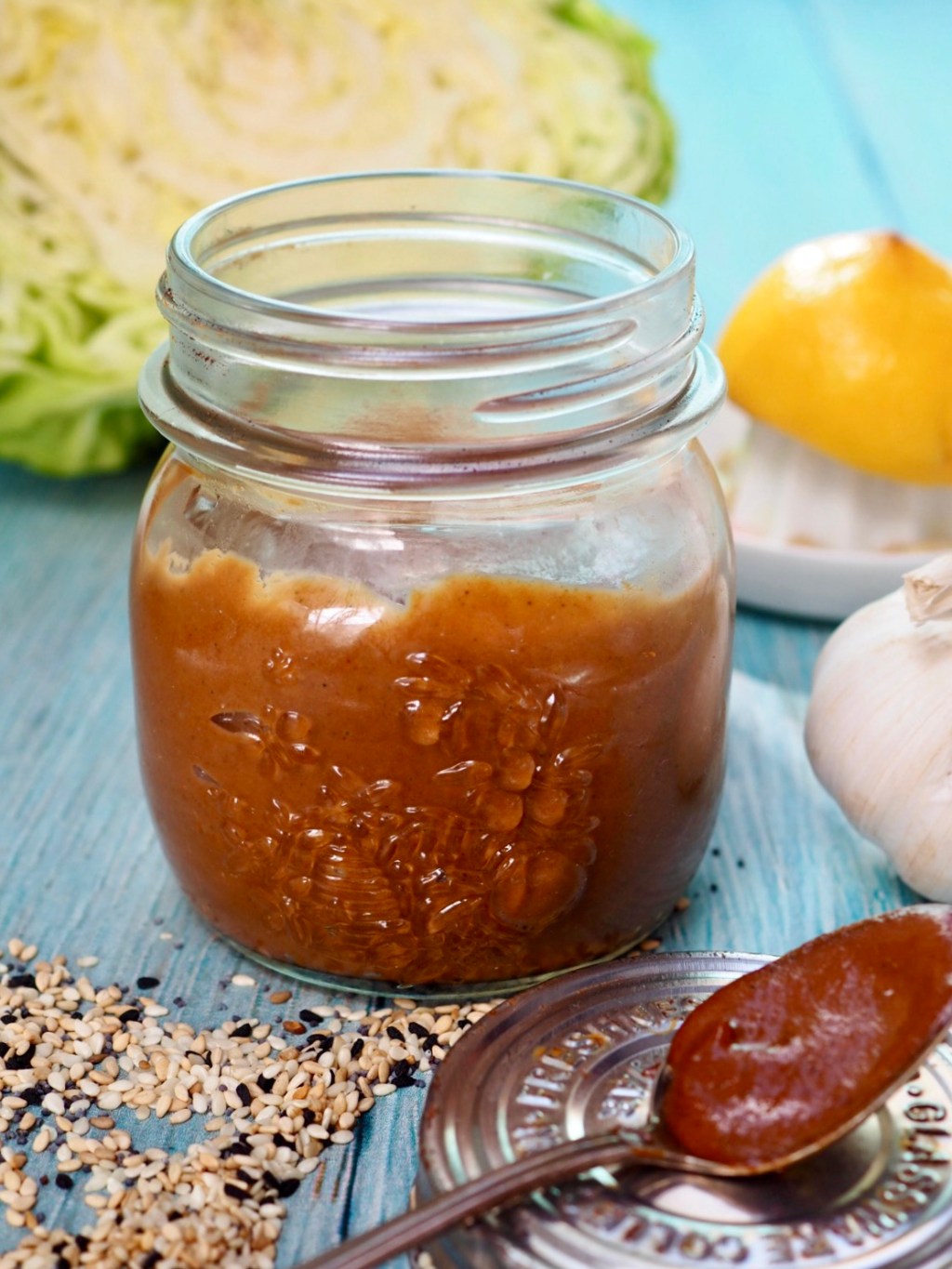 Laita pieneen kulhoon tahini, sitruunamehu, tamari/soija, miso, vaahterasiirappi, hienonnettu valkosipuli, inkivääriä ja sinappi. Sekoita vispilällä, kunnes seos on tasaista.