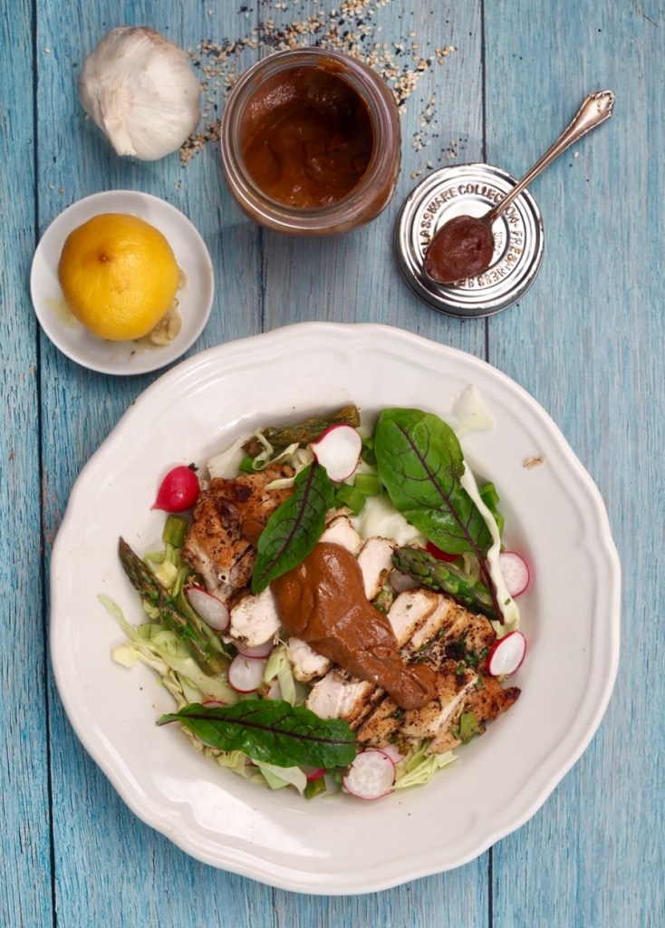 Viipaloi tai kuutoi broileri javasettele salaatin päälle. Lusikoi pälle tahinikastiketta.