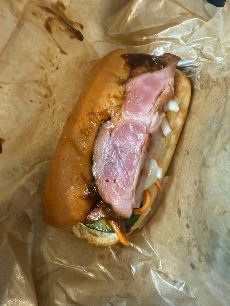 Toinen maistamani ruoka oli vietnamilainen Mini bahn mi possulla. Bánh mì -leipä on perus Ranskan siirtomaavalta-ajalta, jolloin ranskalaiset toivat Vietnamiin oman patonkikulttuurinsa. Vietnamilaiset täyttivät leivän omilla mauillaan, ja siitä tuli suosittu katukeittiöruoka. Olisin kaivannut sitä rapeaa patonkia, nyt banh mi oli tehty hodarisämpylään. Maku oli kyllä hyvä.