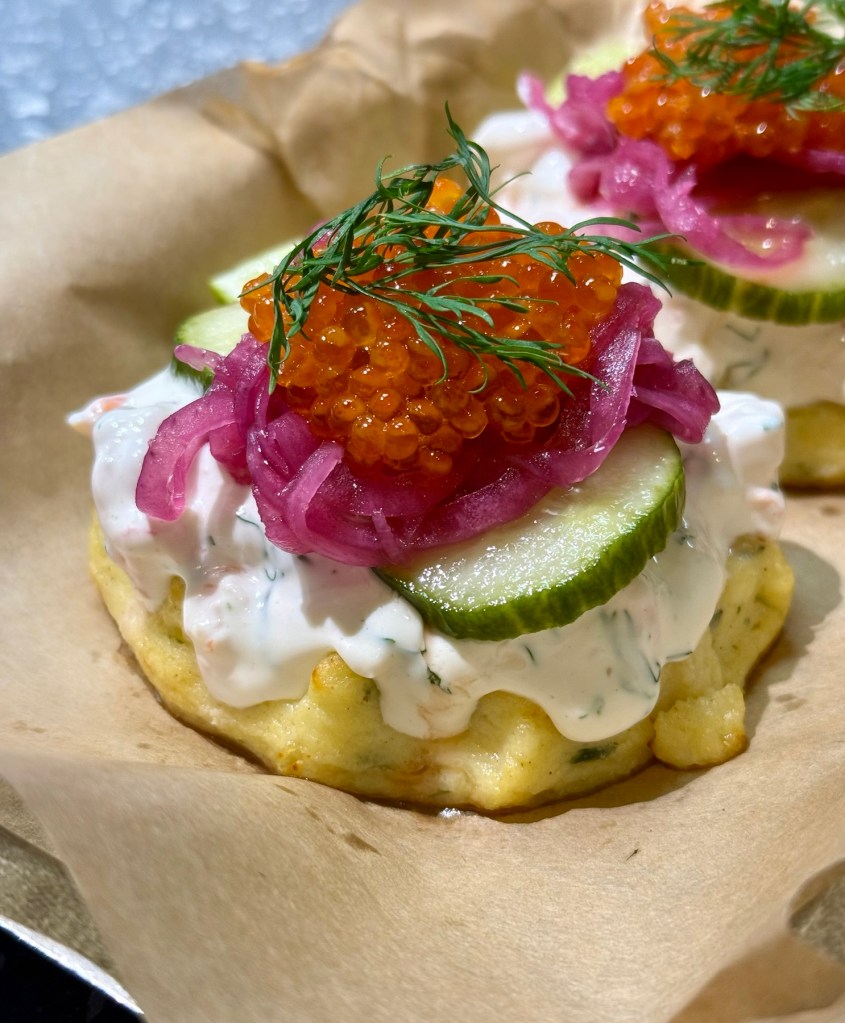 Perunavohveli tarjosi niitä skandinavisia makuja. Annos sisälsi kaksi pientä vohvelit, joiden päällä oli skagenia, pikkelöityä punasipulia ja mummonkurkkua. Komeuden kruunasi kirjolohenmäti. Lounasseurastani perunavohveli oli ehdoton ykkönen.
