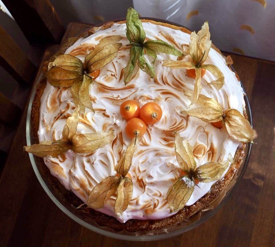 Levitä marenki pehmeästi kakun päälle. Halutessassi voit myös pursottaa marengin. Ruskista pinta kaasupolttimella tai nopeasti kuumassa uunissa.