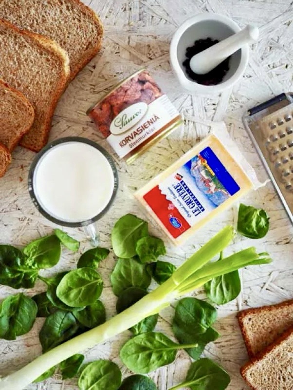 Silppua sienet ja sipuli, kiehauta ne voissa. Lisää pannulle pinaatti ja sekoittele muutama minuutti.