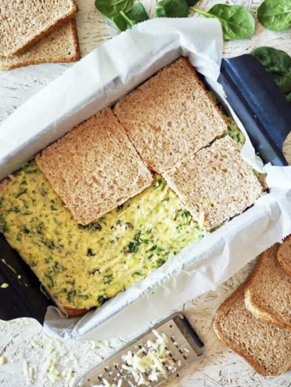 Tässä lämpimässä voileipäkakussa on juustoinen pinaatti-sienimuhennos, joka on koottu paahtoleipäpalojen kanssa uunivuokaan kakun muotoon.