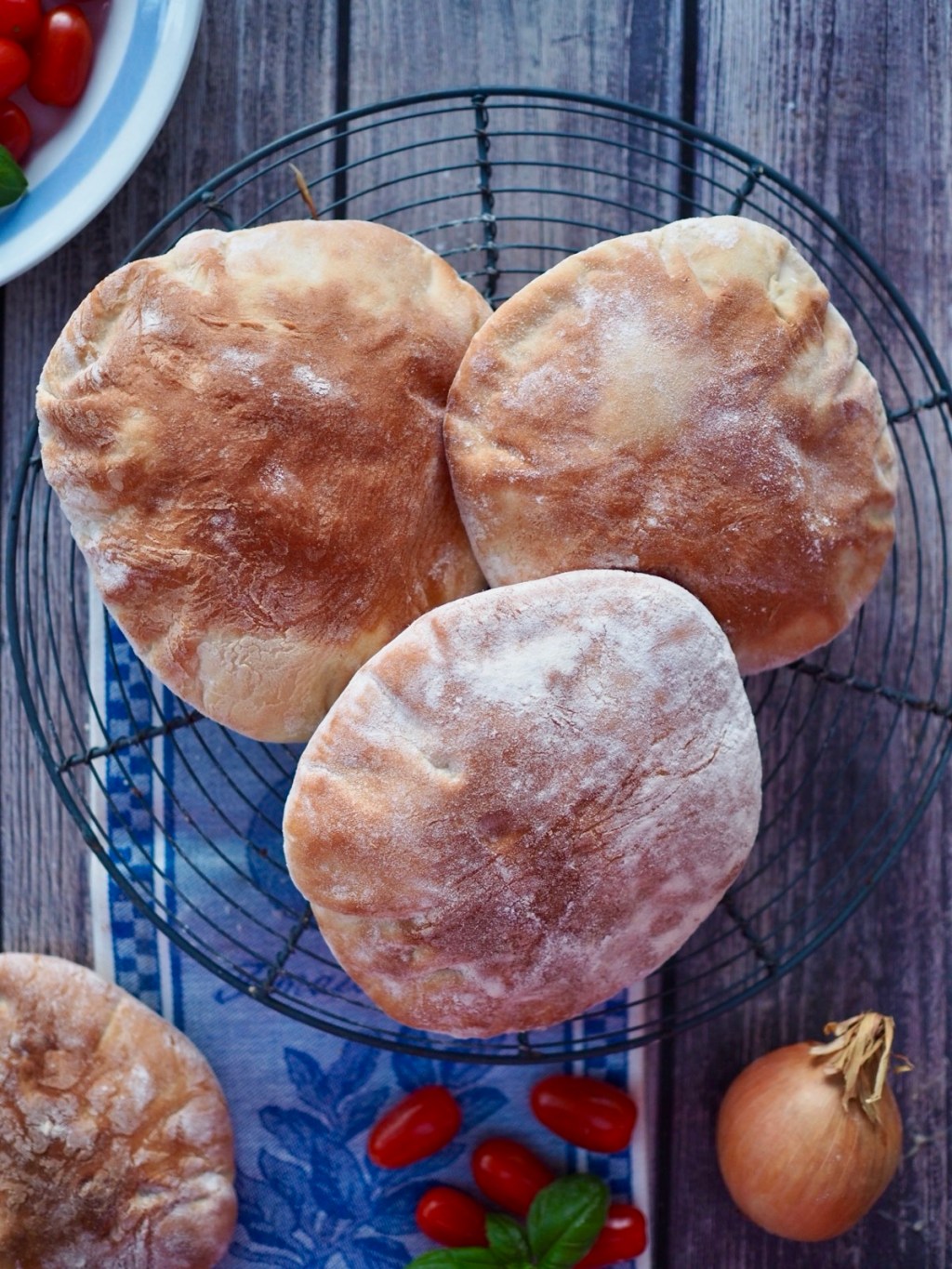 Vuoraa pelti leivinpaperilla ja ripottele sille jauhoja. Jauhot estävät leivän tarttumisen paperiin, ja ne pääsevät vapaasti paistumaan ontoiksi. Jaa taikina jauhotetulla pöydällä neljään osaan. Pyöritä taikinapalat palloiksi, siirrä leivinpaperille ja kohota niitä peitettyinä 10 minuuttia.