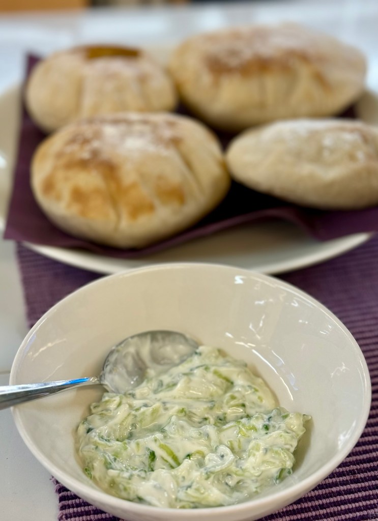 Mieti, missä järjestyksessä valmistat aterian eri osat, jotta sinulla olisi ruokailun alkaessa tuore, lämmin pitaleipä, rapeat halloumi viipaleet sekä raikas, hieman maustunut tsatsiki.