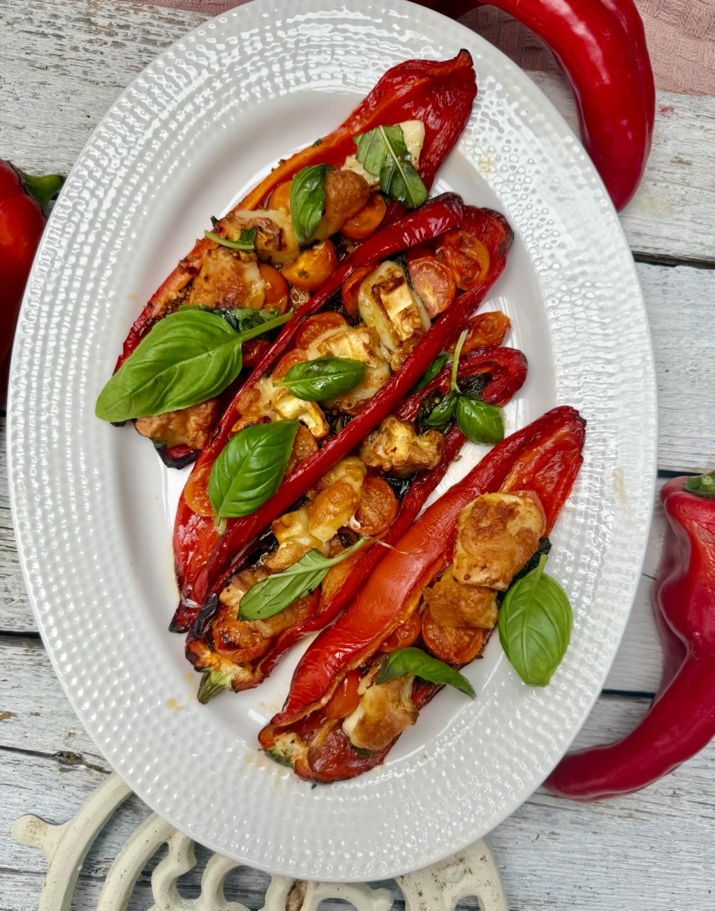 Mausta paprikat sisältä suolalla ja pippurilla. Pane pohjalle rapeaa valkosipulia ja silputtuja basilikanlehtiä päälle tomaatteja ja murenneltu vuohenjuusto. Valuta pinnalle (sitruuna)öljyä.