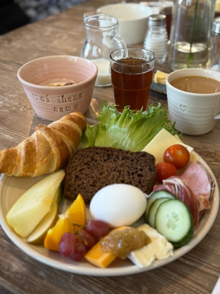 ”Aamiaisella pyrimme tarjoamaan lähellä tuotettuja ruokia. Kaikki kasvikset ovat vähintään Suomessa tuotettuja, mutta kesäaikaan tarjoamme paikallisia kasviksia. Kananmunat tulevat myös lähituotettuna ja leivän leivomme itse kotimaisista jauhoista.”