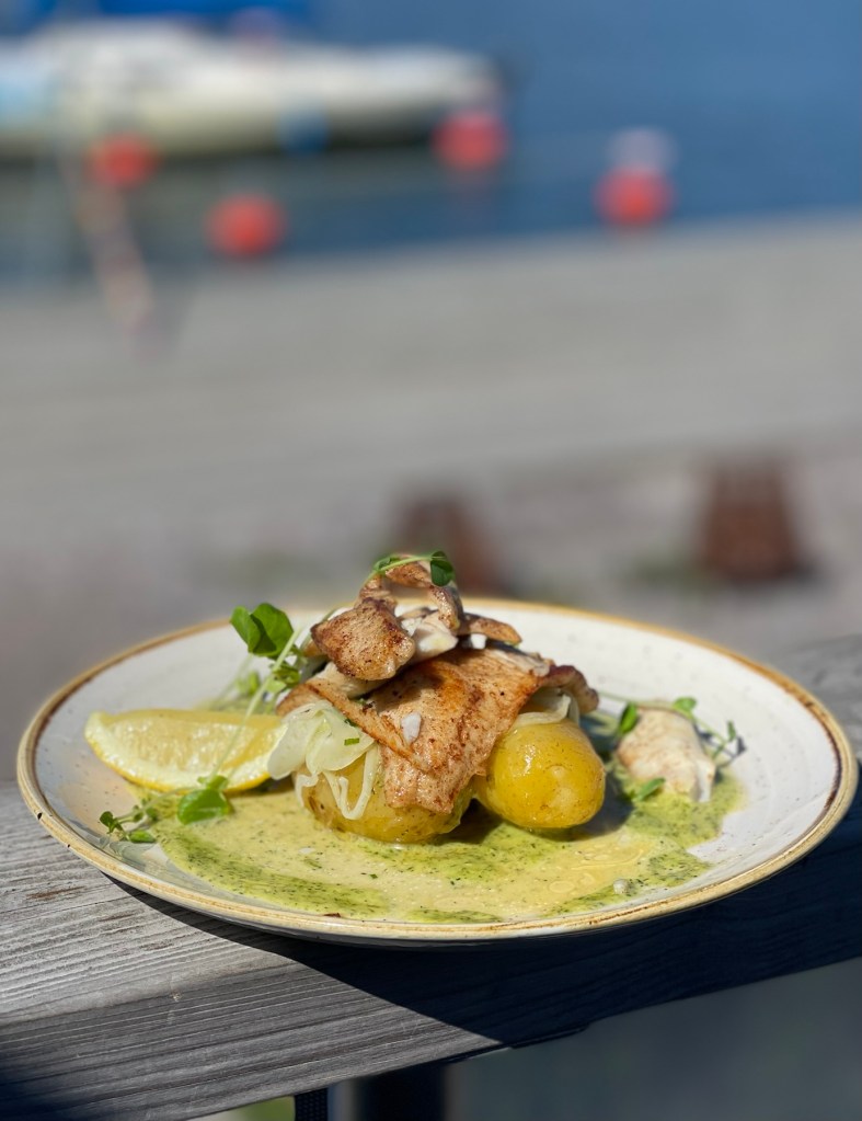 Mathildedalissa vieraillessani etsimme kesäistä ja paikallista lähiruokaa. Ruokalistan perusteella valitsimme Mathildan Marinan, joka sijaitsee meren rannalla. Nautin á la Carte-listalta paistettuja ahvenia, jotka oli pyydetty lähivesiltä, sekä vastapaistetut uudet perunat naapurimaatilan tuotannosta.